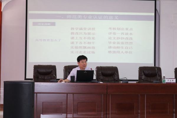 为进一步推进学校师范类专业认证工作,促进学校教师教育质量保障体系建设,提高学校师范类专业建设水平,7月9-10日,学校邀请国家《中学教师专业标准(试行)》主要研制者、国家师范类专业认证专家组培训专家、全国首个师范类专业认证进校考查专家、东北师范大学李广平教授到校开展专题培训,指导认证工作。校党委副书记、校长陈爱华,教学副校长于立新,各处室负责人,教研室主任,全体任课教师以及相关人员参会。会议由副校长于立新主持。