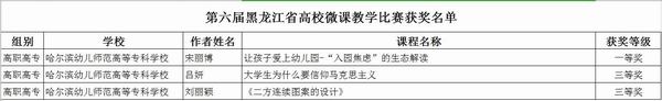 2019年7月-8月,由黑龙江省高校师资培训中心主办的第六届黑龙江省高校微课教学大赛在哈尔滨师范大学举行。经过学校教师制作参赛作品、学校初赛选拔推荐,共计上交参赛作品三份。最后,宋丽博老师上交的《让孩子爱上幼儿园-“入园焦虑”的生态解读》荣获全省一等奖,刘丽颖老师上交的《二方连续图案的设计》和吕妍老师上交的《大学生为什么要信仰马克思主义》双双荣获三等奖。