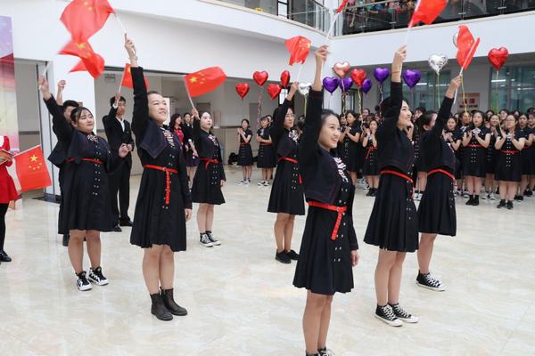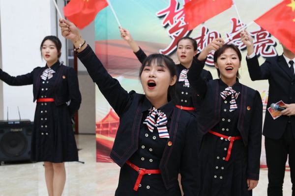 活动中,1728班团支部表演了诗朗诵《今天我们这样爱国》,朗诵者们时而深情款款,时而激情澎湃,她们用富有魅力的声音表达着爱国情怀。团委学生干部们伴随着歌曲“我和我的祖国”摆出了“70”的队形,现场千名学子挥舞着手中的国旗,与表演者共同表白祖国,大声呼喊“祖国,我爱你”,向新中国70周年献礼。