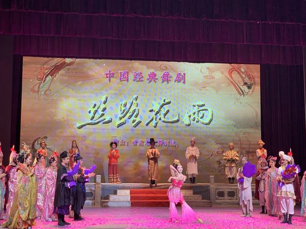 舞剧《丝路花雨》以中国唐朝极盛时期作为背景,以丝绸之路和敦煌壁画为素材,融合了中国古典舞、敦煌舞、印度舞、黑巾舞、波斯马铃舞、波斯酒舞、土耳其舞、盘上舞、新疆舞等多种艺术形式,歌颂了老画工神笔张和歌伎英娘父女俩的光辉艺术劳动,描写了他们的悲欢离合,高度颂扬了中国和西域人民源远流长的友谊。《丝路花雨》不仅“复活”了沉睡千年的敦煌,而且开启了一条传播中华文化之路。
