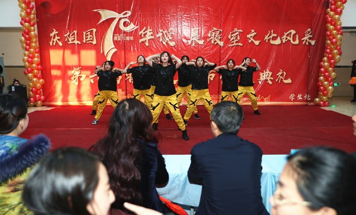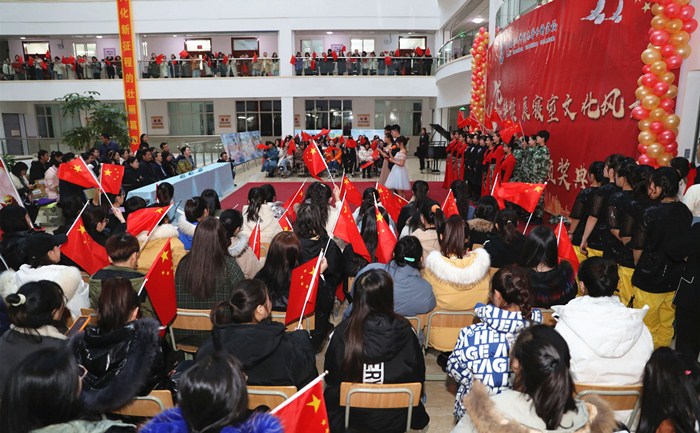 仪式现场,还展示了由1814班选送,展示大学生青春活力的街舞;1808班选送的弘扬中国传统文化的扇子舞《无谓侠》;1930班选送的倡导青年学生铭记历史、爱我中华、奋发图强的诗朗诵《铭记》、由1812班选送的歌伴舞《我爱你中国》等节目。