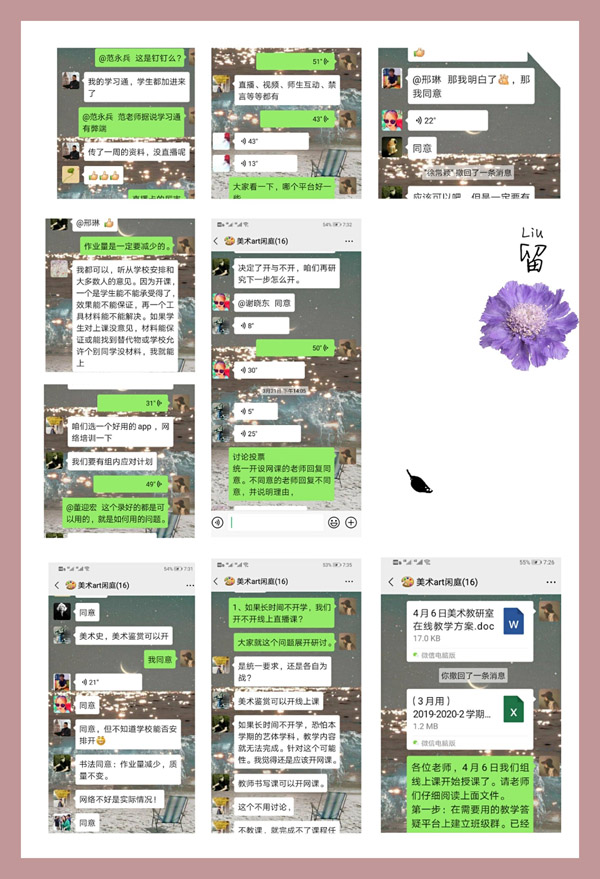 为了解决疫情期间学生购买美术用品的困难细节调整教学计划,组内教师一起交流如何智慧的利用身边的材料的适宜性。