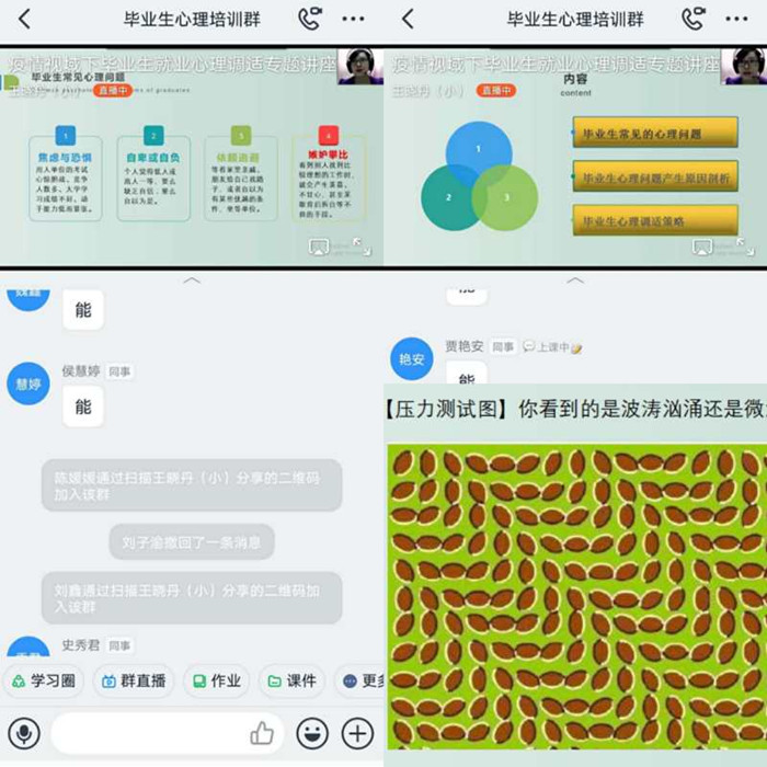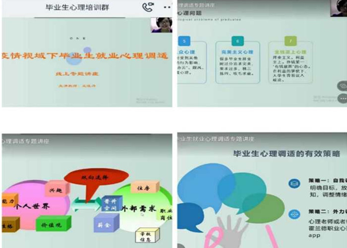 四是从自我调适方面帮助毕业生精准定位就业目标、放平心态、改变认知、调适情绪;从外力调适方面帮助学生建立向专业心理人士求助的思维模式,并分享了各类心理问题的应对策略。