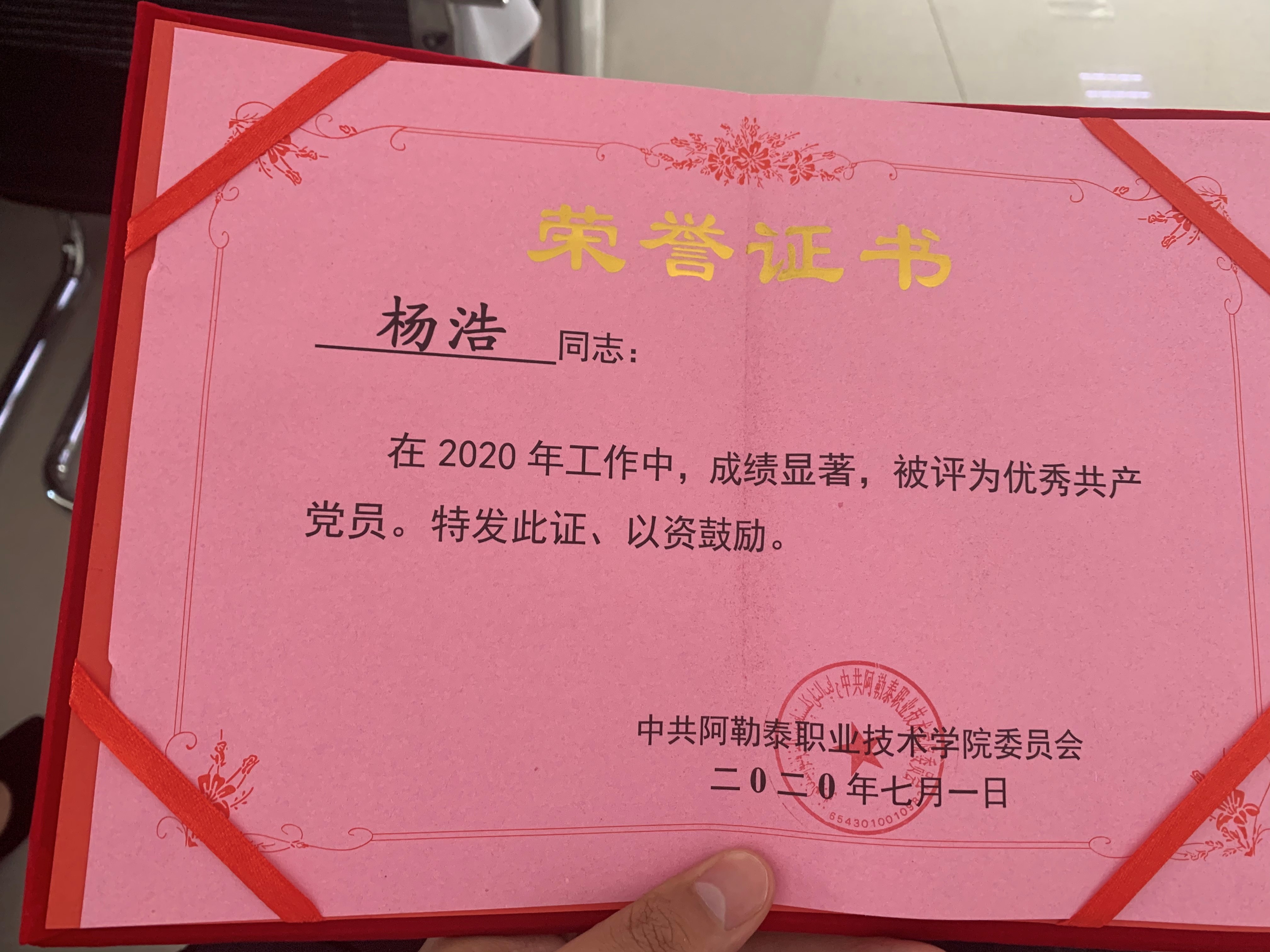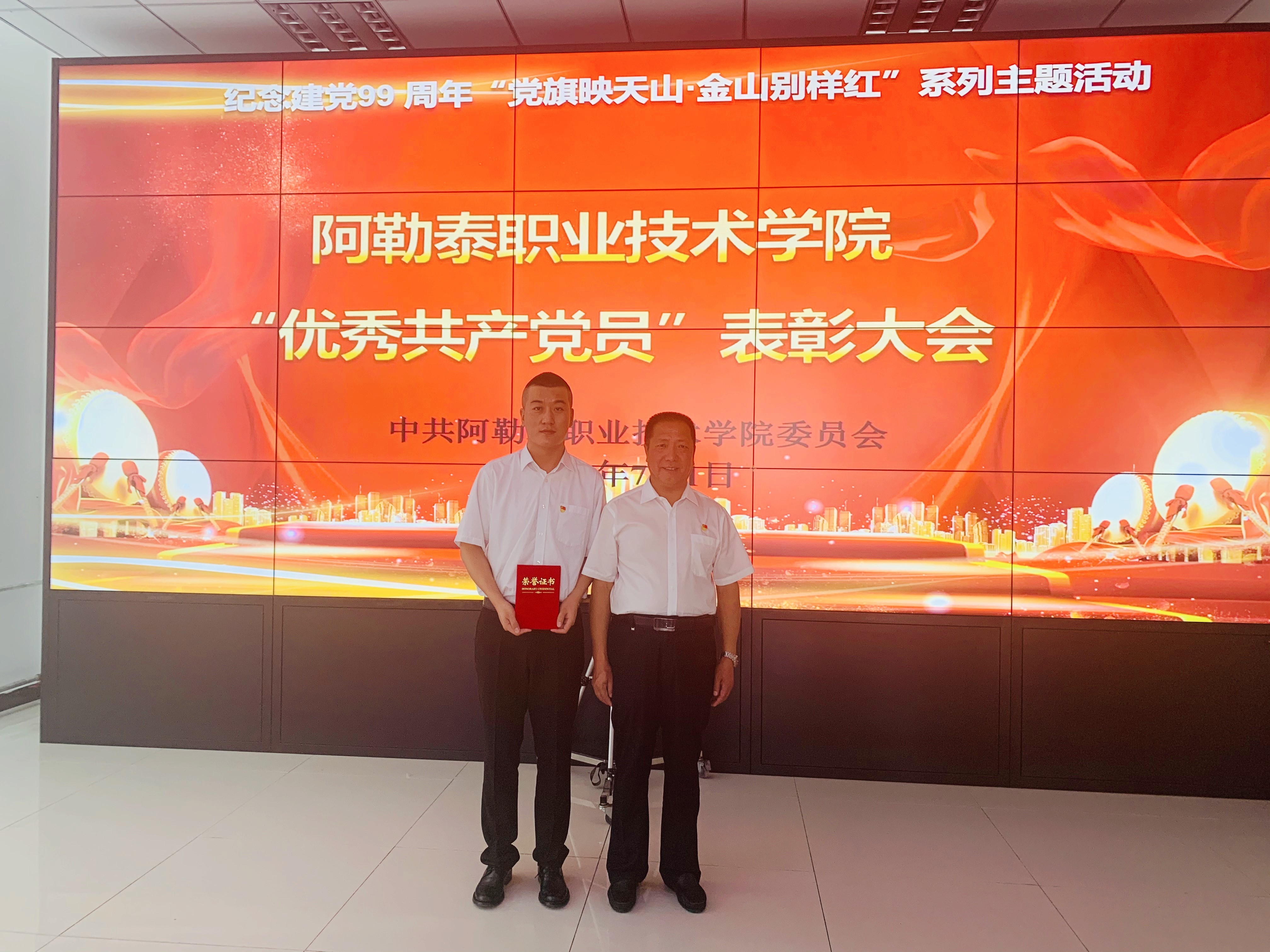 时值党的99周岁生日之际,为表彰先进、弘扬正气,激励和引导广大党员干部见贤思齐、积极工作,中共阿勒泰职业技术学院委员会召开表彰大会,对优秀共产党员给予了表彰。我校派出的教师一支部的援疆教师杨浩同志是第二批黑龙江高职援疆工作的优秀代表,荣获阿勒泰职业技术学院首批“优秀共产党员”荣誉称号。