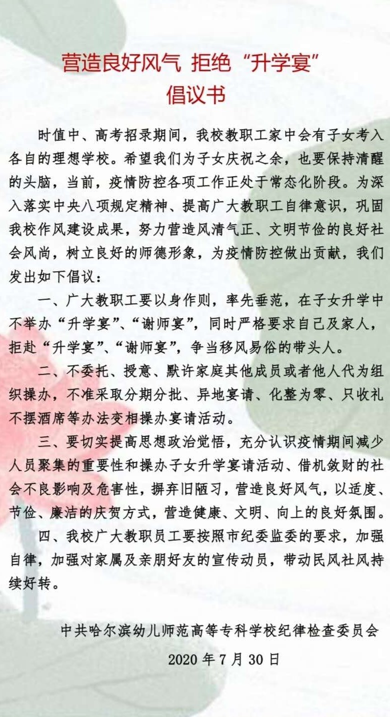 为深入贯彻落实《关于严肃查处违规操办“升学宴”“谢师宴”问题的通知》(哈纪发[2020]6号)精神,在常态化疫情防控形势下,不断巩固拓展作风建设成果,坚决刹住违规操办“升学宴”“谢师宴”等歪风。7月30日,中共哈幼专校纪委向全校各部门下发了相关文件,并通过多项举措禁止教职工操办及参加各类升学宴请活动。