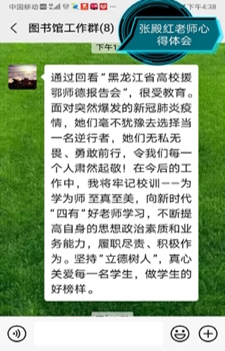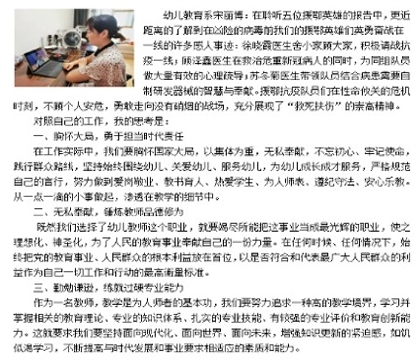 报告会由省教育厅教师工作处王海君处长主持,省教育厅副厅长姜同河讲话,他从新时期特别是在疫情防控期间,如何进一步强化师德师风教育;坚守高校教师新时代十项行为准则;牢固树立师德底线,始终保持严惩违纪违规行为的高压状态;进一步加强高校师德教育建设,不断完善师德师风表彰和惩治双重机制等四方面进行了工作部署。5位来自省属医学院校的援鄂教师代表,为大家分享了抗疫斗争中的感人事迹,彰显了中国特色社会主义制度的优势,字字感人至深,句句催人奋进。会后,我校以部门为单位组织回看,教职工交流观看心得。援鄂英雄们真挚的情怀,艰辛的付出,敢于担当,勇于奉献的精神在大家心中掀起了波澜,引起了强烈的反响。教师们纷纷表示,援鄂高校教师的先进事迹真实生动,是新时代高校教师践行师德的生动教材。我们将以他们为榜样,厚植爱国主义情怀,遵守师德规范,自觉将行动落实到疫情防控以及今后的教育教学全过程,努力成为有理想信念、有道德情操、有扎实学识、有仁爱之心的“四有”好老师。