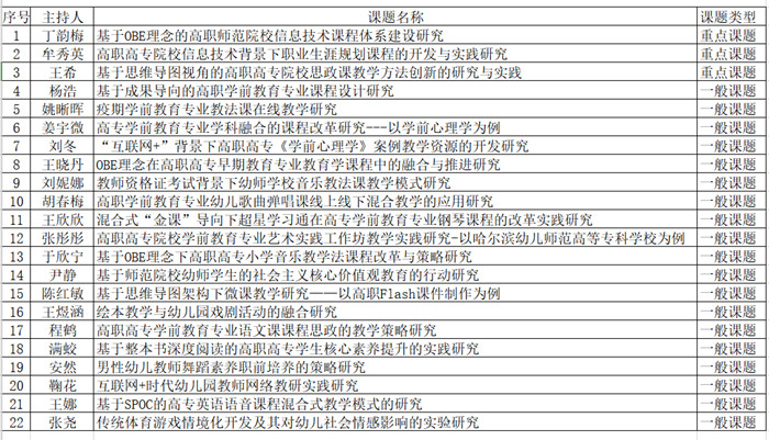经学校科研督导处对23份评审书初步把关上报、省教育学会专业委员会的初审、评审,目前我校有22位教师收到黑龙江省教育学会2020年教育科研规划课题立项通知,其中重点课题3项,一般课题19项。立项教师多为青年教师,希望各位教师以此为契机,立足专业、扎实开展研究、提高研究成果质量、提升自身科研水平。