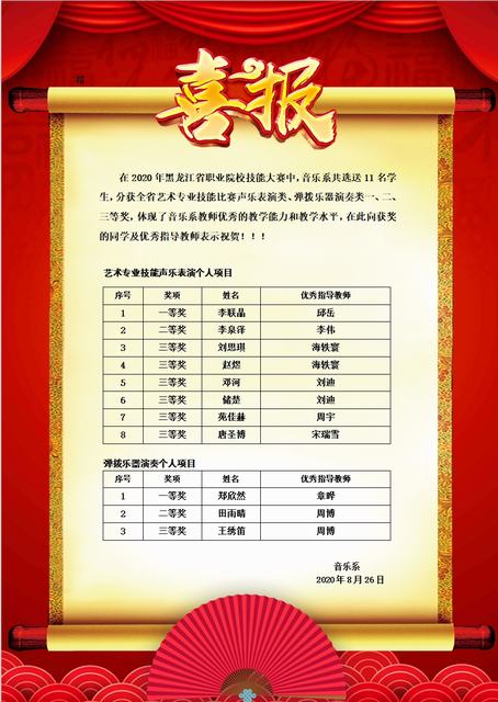 8月26日,省教育厅公布了2020年黑龙江省职业院校技能大赛获奖成绩,我校音乐系教师邱岳、海轶寰、周博、章晔、李伟、刘迪、周宇、宋瑞雪指导的11名参赛学生获奖,8名教师全部获得优秀指导教师奖励。全部获奖学生中,音乐教育专业学生5人、音乐制作专业学生3人。