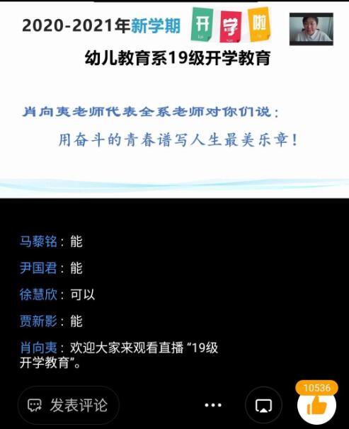 8月31日早自习时间,幼儿教育系学前教育专业、早期教育系早期教育专业、幼儿发展与健康管理专业、音乐系音乐教育专业、音乐制作专业、英语教育系英语教育专业、现代服务系空乘专业和美术专业等6位系部、专业负责人共讲《第一课》,以《欢迎回家》、《珍惜时光,向着梦想彼岸勇往直前》、《用奋斗的青春谱写人生最美乐章》、《坚持理想、创造无悔于时代的人生》、《敬畏生命,不负韶华》、《不一样的秋天》、《放眼未来,规划现在》等为主题,通过钉钉、腾讯视频、QQ等线上平台,从疫情防控、生命教育、就业形势分析指导、新学期学习内容与方法等方面为学生共讲第一课,从思想上、专业上帮助、引领学生进入新学期,做好线上线下学习衔接。