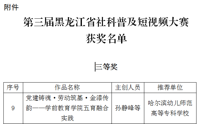 近日,由黑龙江省社科联主办第三届黑龙江省社科普及短视频大赛评选结果揭晓。我校选送的作品《党建铸魂 劳动筑基 金漆传韵——学前教育学院五育融合实践纪实》,经上级部门审读评审,荣获三等奖。这是我校第二次荣获此类奖项,充分展现了我校在社科普及工作中的持续努力与良好成效。