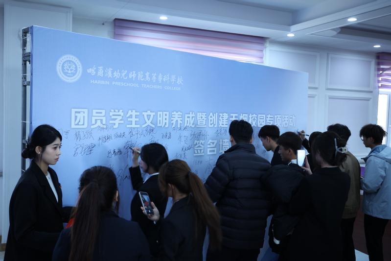 仪式最后,学生代表有序地在主题签名墙郑重签名,表达积极参与专项活动的意愿,一笔一划间,不仅是对“拒绝烟草、践行文明”的坚定承诺,更彰显了哈幼专学子主动参与文明校园建设的责任担当。
