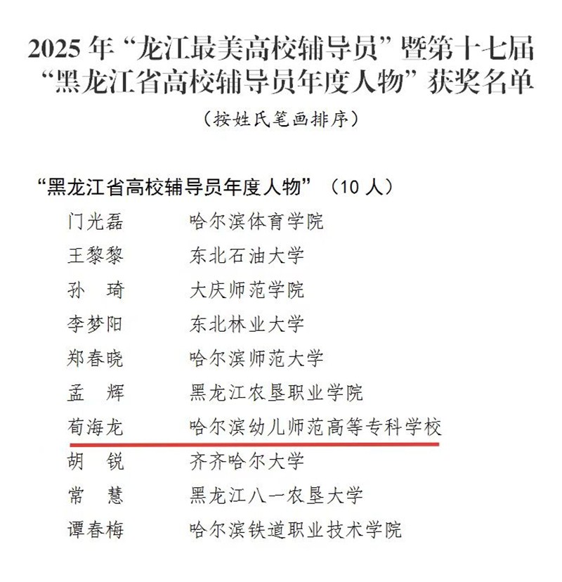 本次活动共推选出2025年“龙江最美高校辅导员”10人,“黑龙江省高校辅导员年度人物”10人。经学校推荐、专家评审、现场答辩等环节的激烈角逐,我校学前教育学院辅导员荀海龙荣获第十七届“黑龙江省高校辅导员年度人物”荣誉称号。