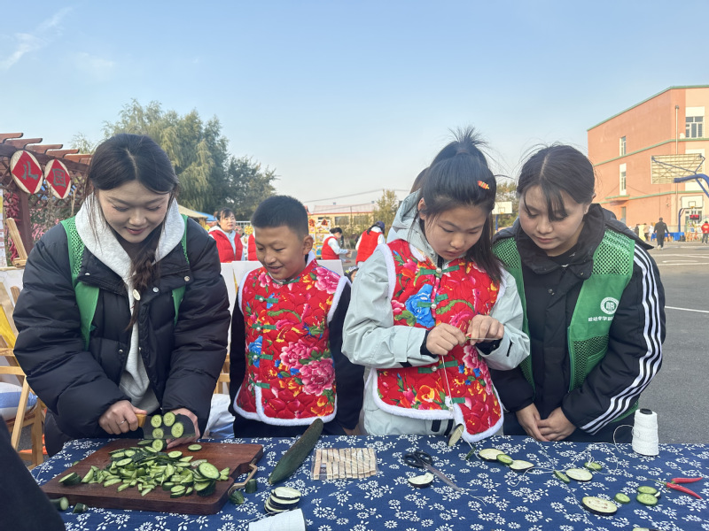 活动以“实践教学+互助协作”为核心,学子以“助教+伙伴”的双重身份,为小朋友提供沉浸式生活劳动技能服务。活动现场,学子们先带领小朋友共同完成黄瓜清洗,随后细致讲解“安全握刀、均匀切片”的核心技巧并手把手示范,再引导大家将瓜片串制后整齐摆放晾晒。全程以“边教边做、边学边干”的互动模式,让学子在技能输出中深化专业认知,小朋友在亲身实践中掌握基础劳动本领,既实现了生活技能的温情传递,更彰显了服务性劳动的互助价值。
