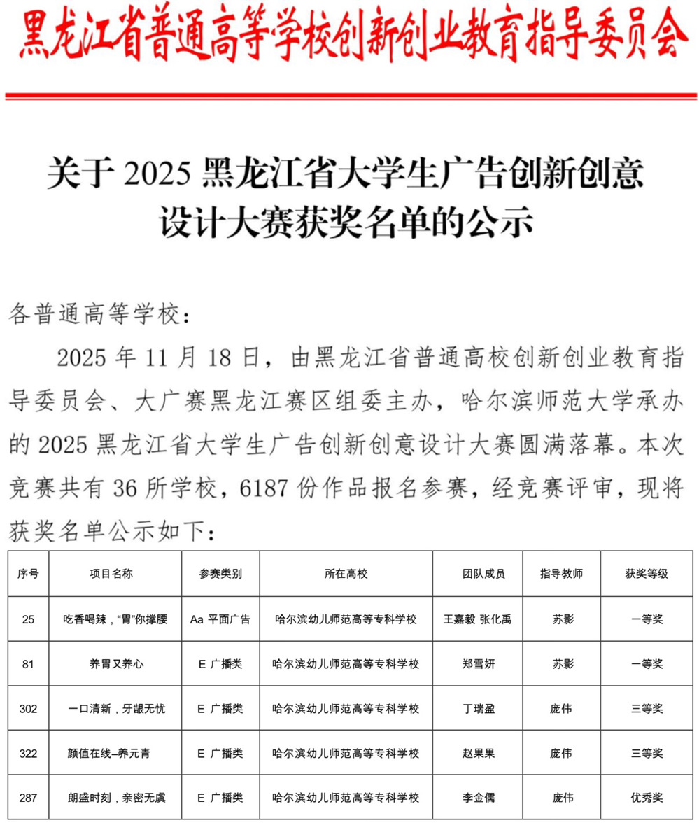 近日,第十七届大广赛黑龙江赛区全省等级奖(暨2025黑龙江省大学生广告创新创意设计大赛)获奖名单揭晓,我校传媒与文旅学院2024级传播与策划专业学子首次参赛即实现该赛事获奖零的突破,斩获省级一等奖两项、三等奖两项、优秀奖一项,用创意实力为校争光,为青春添彩。