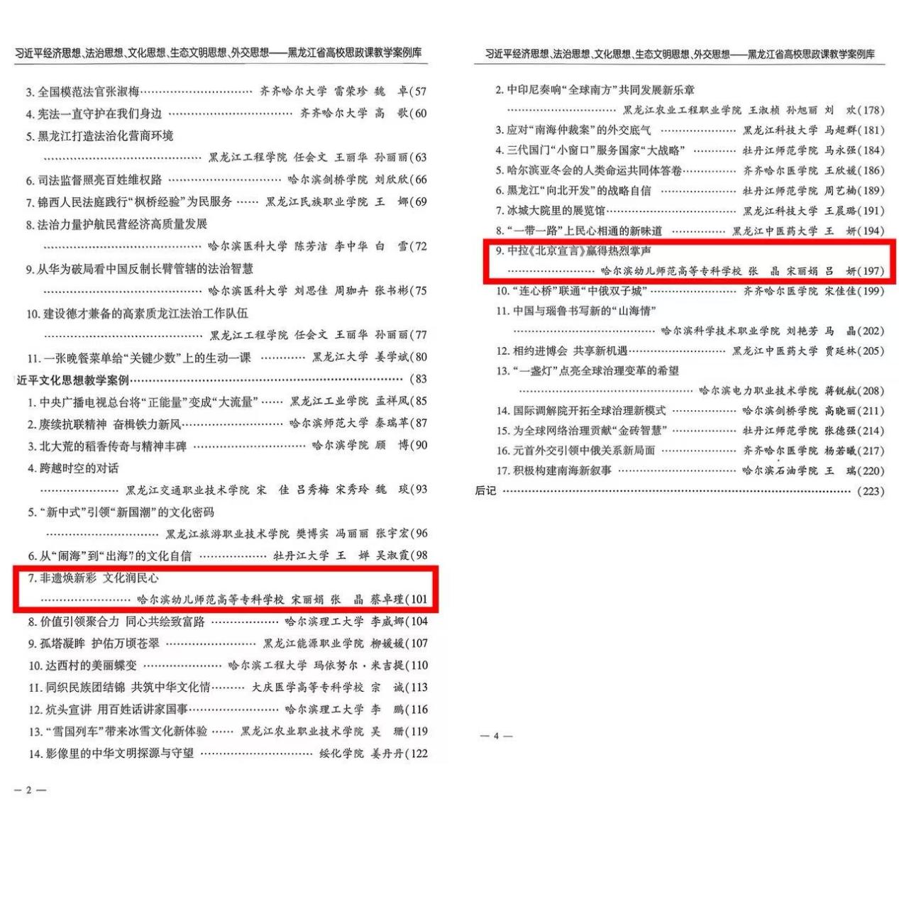 近日,由省委教育工委、省教育厅联合印制的《习近平经济思想、法治思想、文化思想、生态文明思想、外交思想——黑龙江省高校思政课教学案例库》作为思政课教学参考资料正式下发全省各高校。我校马克思主义学院教师张晶、吕妍、宋丽娟、蔡卓瑾共同完成的《非遗点亮春晚:文化自信的高光展示》《中拉<北京宣言>为何赢得热烈掌声》2项教学案例成功入选,彰显了学校在思政课教学改革与理论研究领域的扎实功底和显著成效。
