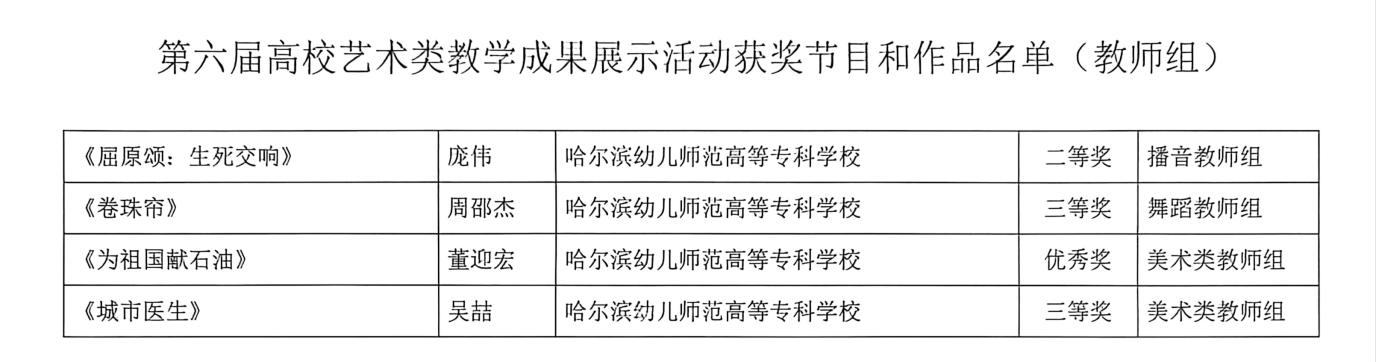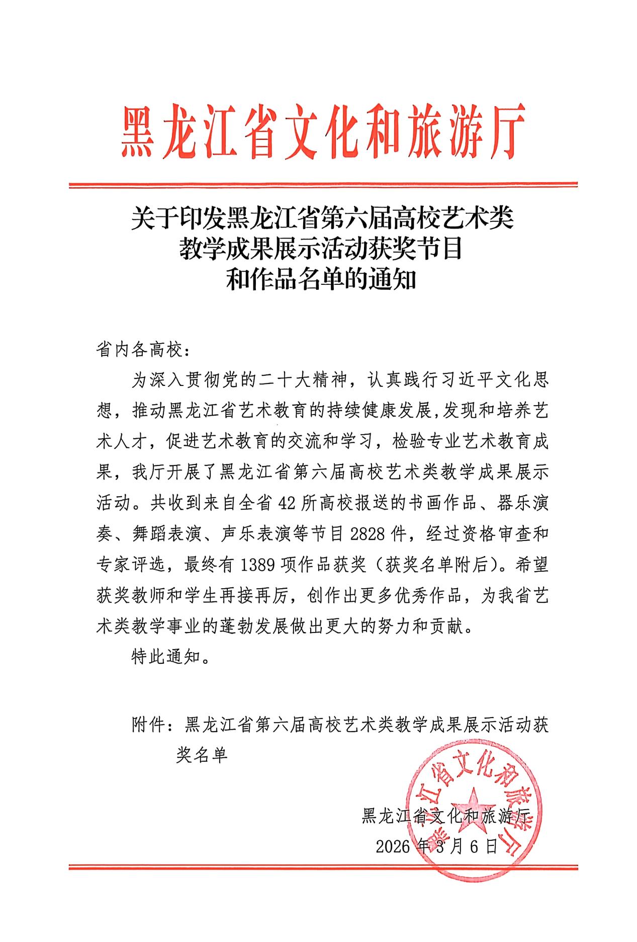 近日,黑龙江省文化和旅游厅发布《关于印发黑龙江省第六届高校艺术类教学成果展示活动获奖节目和作品名单的通知》,艺术学院在此次教学成果展示活动中,凭借优秀的作品与师生们不懈的努力,共斩获31项奖项荣誉,其中,二等奖4项,三等奖12项,优秀奖15项,为学院与学校赢得了新的荣誉!