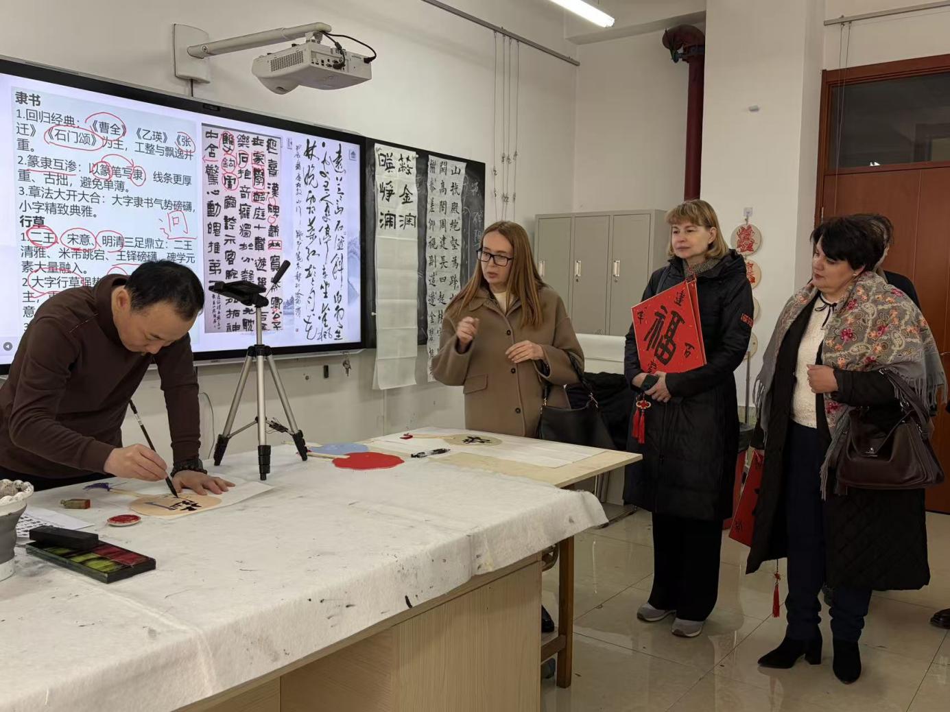 座谈结束后,访问团一行先后参观了艺术学院教学场地和实训楼,近距离观摩了声乐、舞蹈、书法课程教学现场。访问团成员不时驻足观看、点头称赞,对我校注重中华优秀传统文化传承、强化学生技能培养的教育理念给予高度评价。参观过程中,谢晓东老师现场挥毫,为访问团赠送书法作品,以笔墨为媒传递中俄两国人民的友好情谊。