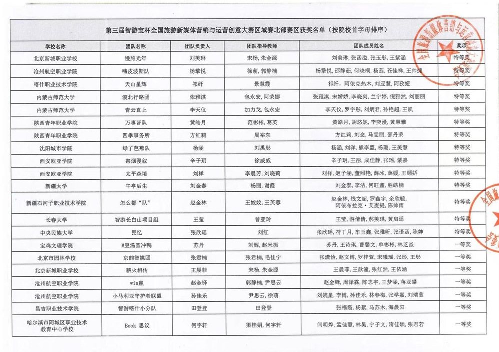 其中,由杜爽、齐子漫、陈亦冰、郭军奥、任依林、李双伶组成的“智启未来”队,凭借新颖的营销创意、扎实的专业功底和优质的作品呈现,斩获北方赛区一等奖,成功跻身全国总决赛。由王鑫瑜、王欣、周思睿、于欣佩、王诗琪、侯佳怡组成的“智友星途”队,奋勇争先,荣获北方赛区二等奖,充分彰显了研学旅行专业学子的青春风采与专业素养。
