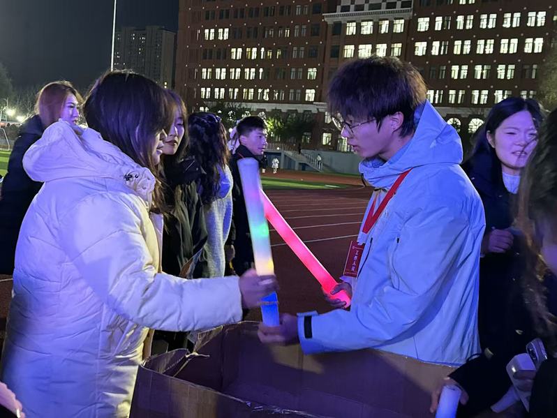 活动当天,不少同学难掩兴奋早早来到现场,领取荧光棒和头饰的区域排起长队,台下观众热情洋溢地挥舞手中的荧光棒,期盼活动开始。