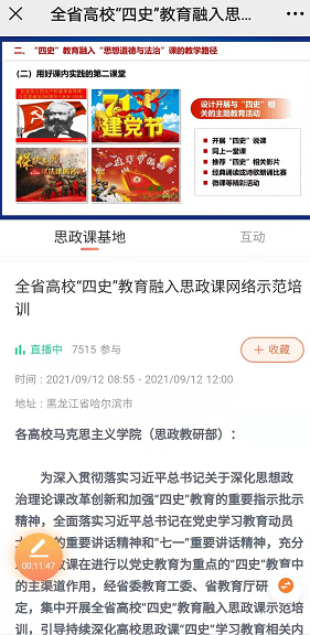 为深入贯彻落实习近平总书记关于深化思想政治理论课改革创新和加强“四史”教育的重要指示精神,全面落实习近平总书记在党史学习教育动员大会上的重要讲话精神和“七一”重要讲话精神,充分发挥思政课在进行以党史教育为重点的“四史”教育中的主渠道作用,2021年9月12-17日,思政教学部全体教师参加了全省高校“四史”教育融入思政课网络示范培训。