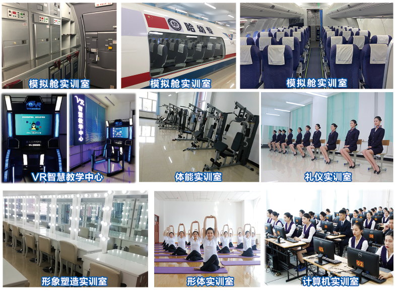 学校教学设施设备齐全,引进各类航空专业设备,建立多个航空专业实训室,如波音737和空客320综合训练飞机模拟客舱、VR智慧教学中心、体能实训室、形体训练中心、礼仪实训室、形象设计实训室等校内实训基地。