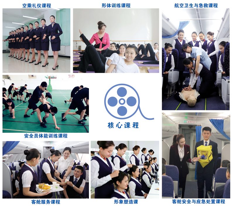 民航概论、民航乘务英语、民航法规、民航地理、航空服务礼仪、客舱服务、客舱设备、空乘服务沟通与播音技巧、民航安全与应急处置、形象设计与化妆技巧、形体与舞蹈、安全员体能训练、面试技巧、普通话、航空卫生与急救、机场咨询服务与VlP接待服务、民航旅客运输、地勤服务、航空售票服务等。