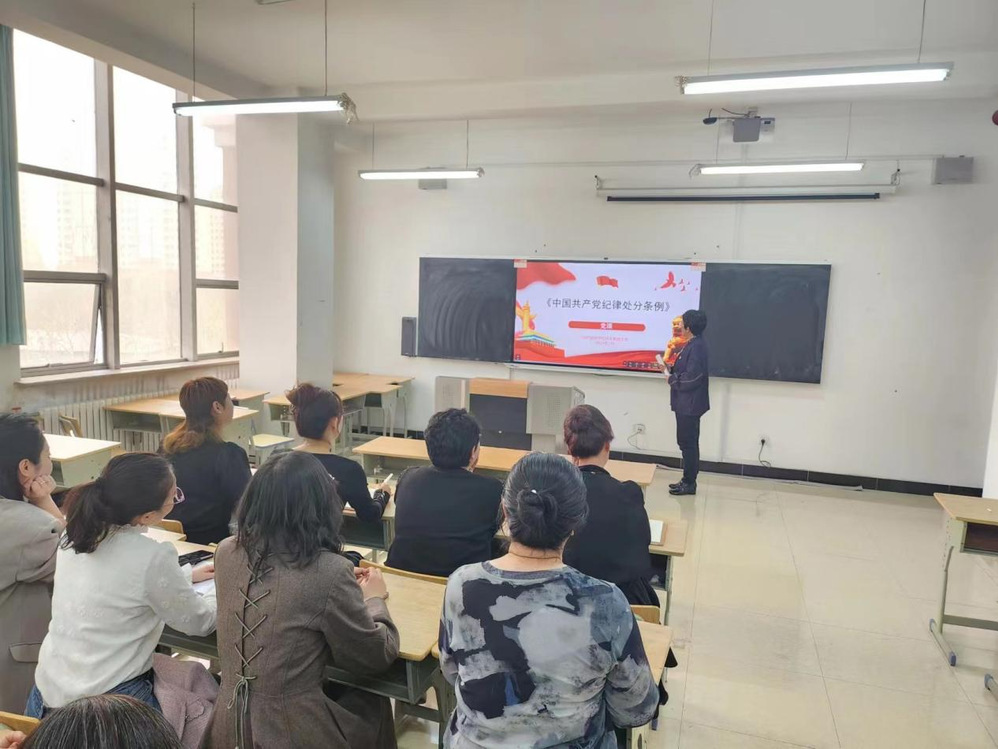 党支部书记王莹紧扣《条例》原文、联系实际工作,帮助大家更好理解、领会《条例》修订的背景意义、重要原则、主旨要义;依托典型案例,党员教师认真思考,积极讨论,进一步强化了纪律意识,增强了政治定力、纪律定力、道德定力、抵腐定力,敦促所有党员教师始终做到忠诚干净有担当。