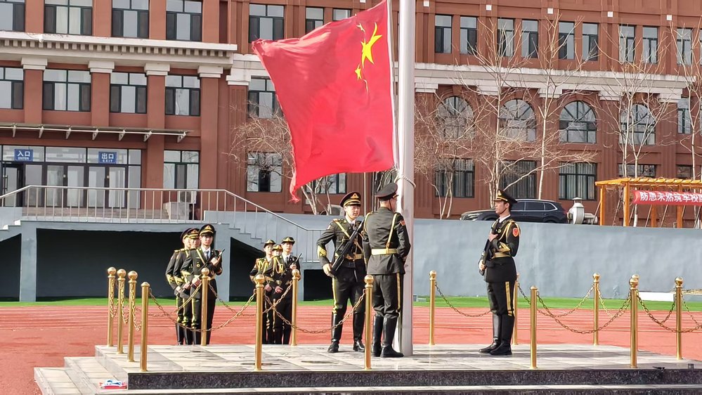 清晨7时30分,全体人员整齐列队、精神饱满。伴随着激昂的乐曲,国旗护卫队迈着铿锵有力的步伐护送国旗入场。在庄严雄壮的《中华人民共和国国歌》歌声中,五星红旗冉冉升起,全体师生肃立注目,高唱国歌,表达对祖国的无限热爱与崇高敬意。