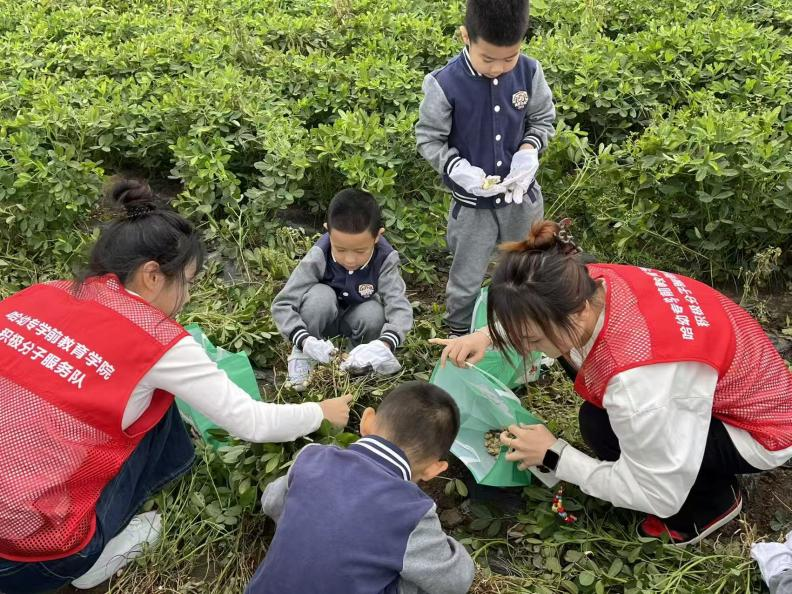丰收节首站为花生田,翠绿藤蔓尽显生机。志愿者以丰收向导身份,教孩子“观藤找果”“抓藤速拔” 技巧,再陪小朋友开启探秘之旅。志愿者帮抖土装袋,讲解“花生是劳动的丰收礼物”,帮助孩子树立“劳动创丰收”意识,田间满是欢笑。