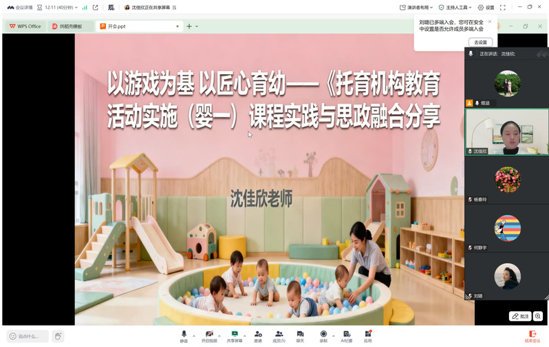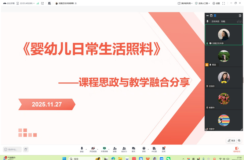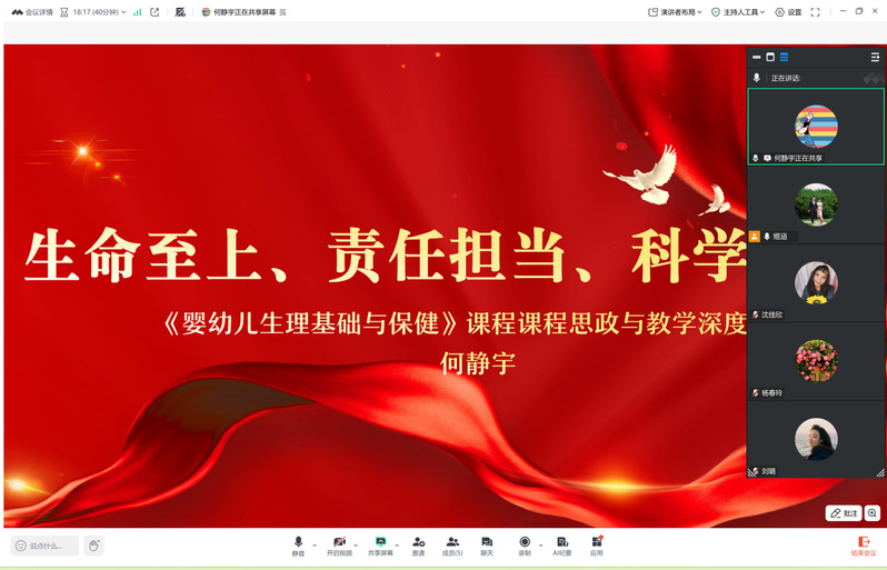 外聘教师杨春玲老师则针对《婴幼儿疾病预防与安全防护》课程,结合婴幼儿常见疾病预防、安全风险规避等实践要点,强调了如何融入底线思维、应急处置能力及守护婴幼儿健康安全的职业使命。各位教师的分享紧贴教学实际,案例具体、思路清晰,为后续课程思政建设提供了宝贵的实践参考。