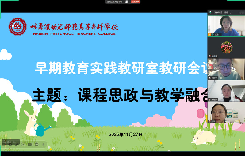为深入推进课程思政与专业实践教学的深度融合,切实提升早期教育、婴幼儿托育服务与管理专业人才培养质量,2025 年 11 月 27 日,哈尔滨幼儿师范高等专科学校学前教育学院早期教育系早期教育实践教研室通过腾讯会议召开线上教研会议。会议由教研室主任王煜涵主持,全体教研室教师及外聘教师杨春玲老师参会,围绕“课程思政与实践教学融合” 主题展开深入研讨与经验交流。