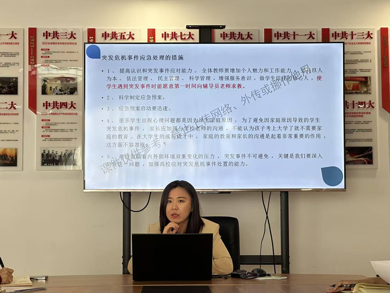 而突发危机事件应急处理措施的讲解,更是直击辅导员工作痛点。刘静从“预警预判、现场管控、信息上报、多方协同、后续跟进”五个关键环节入手,梳理出一套可落地、可复制的应急处置流程。她以某学生突发心理情绪失控事件为例,详细讲解了如何第一时间做好情绪安抚、如何快速联动学校心理中心与家长、如何制定后续帮扶方案等具体操作要点,强调“快速响应、精准施策、全程关怀”是化解突发危机的核心,帮助在场辅导员理清了应急处置的思路,掌握了实用的工作方法。