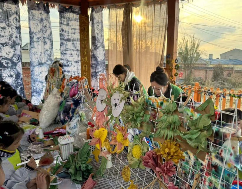 “我的方巾变成蓝色啦!”“我扎的花纹像小花朵!” 幼儿们看着自己亲手制作的扎染作品,脸上洋溢着兴奋与自豪。在等待染料固色的间隙,大学生们结合扎染过程,向幼儿讲解 “耐心等待才能收获美好”“团结协作效率更高” 等劳动道理,引导幼儿感知劳动中的坚持与协作之美,深化劳动教育的价值引领。党支部还设计了“作品分享会”环节,鼓励幼儿介绍自己的创作思路,大学生们则从专业角度进行点评与鼓励,既锻炼了幼儿的表达能力、强化了劳动成就感,也让大学生在服务中提升了实践能力,实现劳动教育与专业培育的双向赋能,切实落实了“以劳树德、以劳增智、以劳强技”的育人目标。