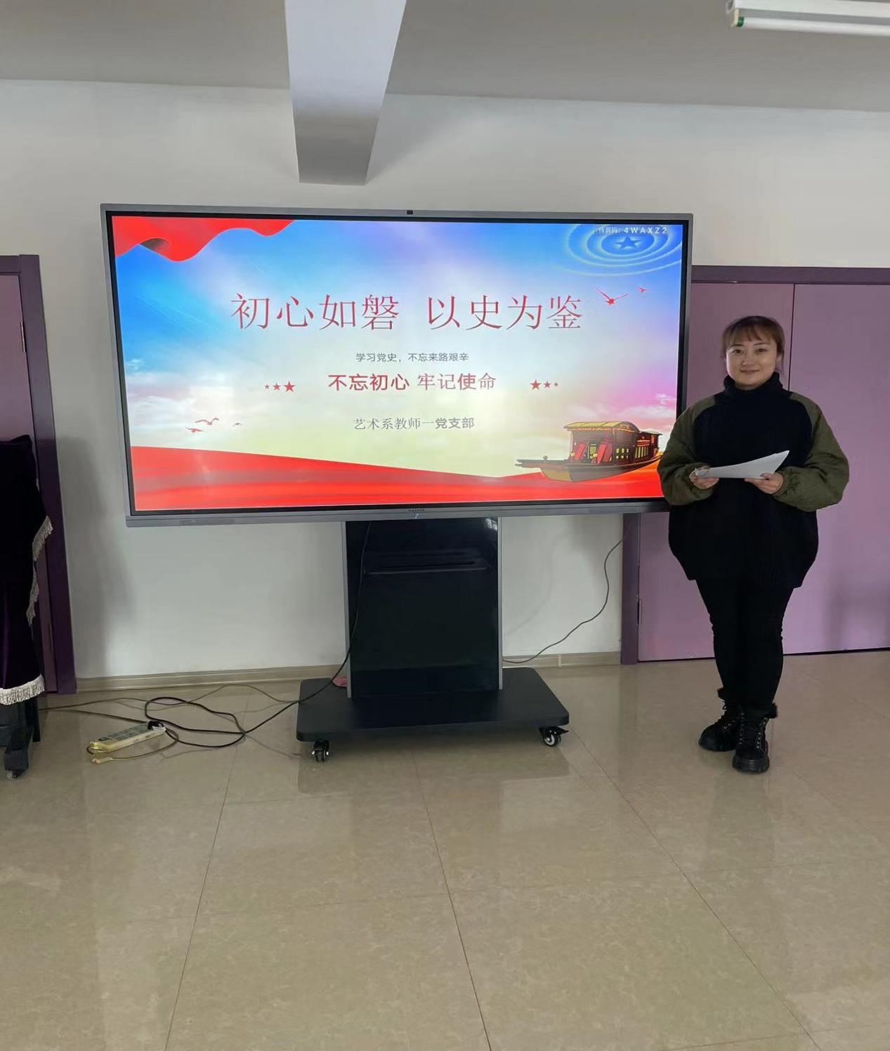 2021年11月26日,艺术系教师一支部组织开展“党史学习”主题活动。支部宣传委员姚瑶讲授题为“初心如磐 以史为鉴”的专题党课,带领支部全体党员重温了中国共产党的百年建党史。