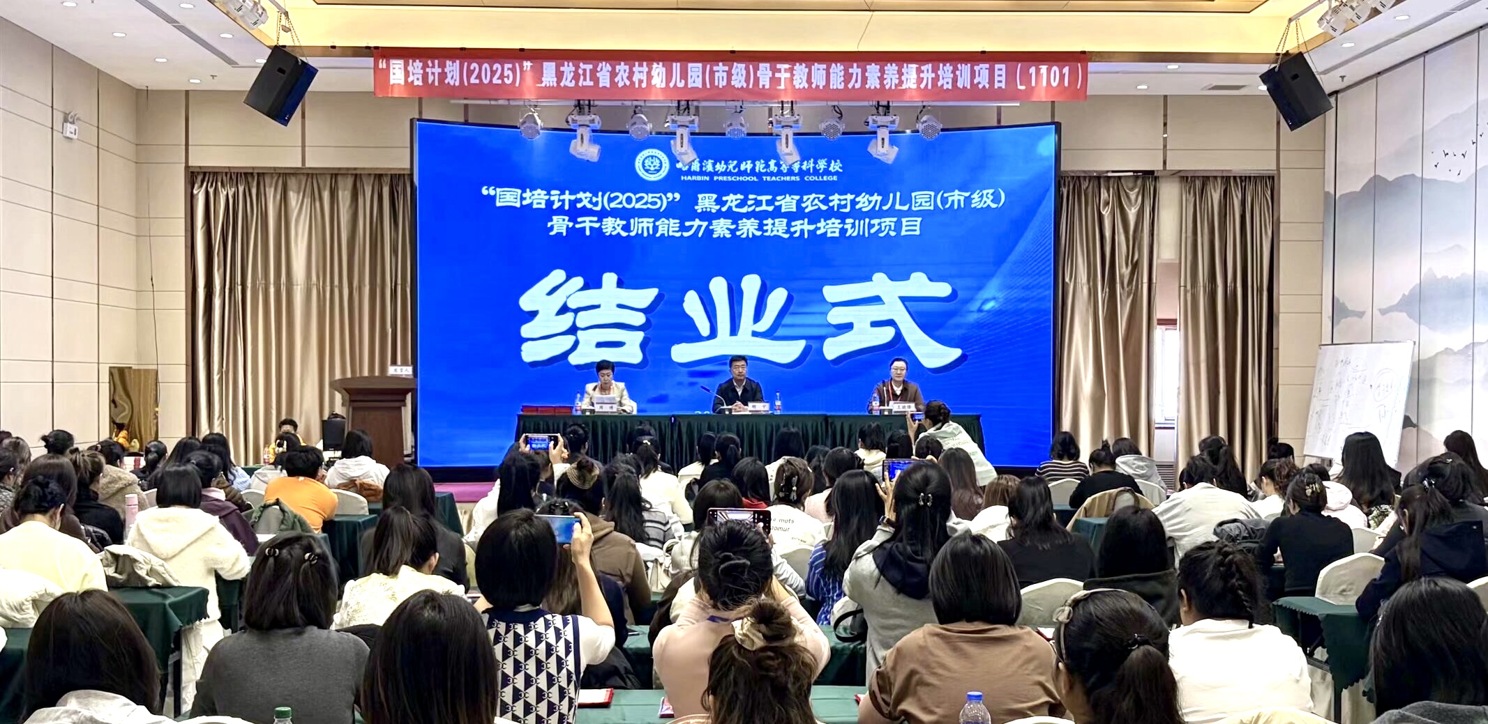 10月26日,由哈尔滨幼儿师范高等专科学校承办的“国培计划(2025)”——黑龙江省农村幼儿园(市级)骨干教师能力素养提升培训项目结业仪式隆重举行。此次培训历时15天,来自全省各地的150名农村幼儿园市级骨干教师圆满完成各项学习任务,顺利结业。国培项目总指挥,学校党委委员、副校长胡宁出席结业式并致辞,仪式由社会服务与对外交流中心副主任周博主持。