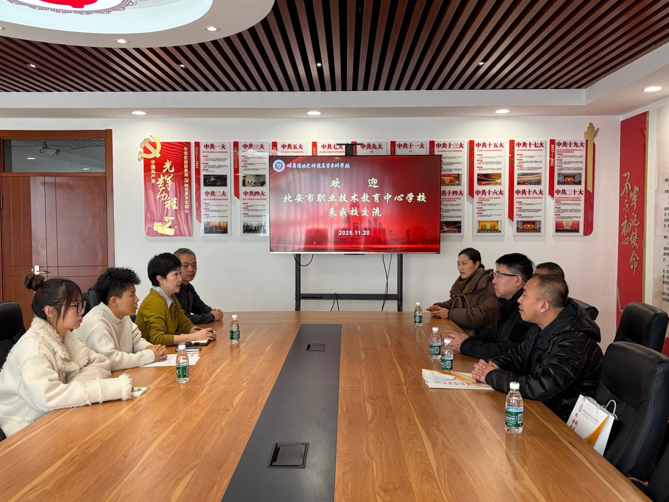 11月20日,北安市职业技术教育中心学校校长带队一行 4人来我校开展交流活动。社会服务与对外交流中心、学前教育学院热情接待,双方围绕托育实训室建设、高技能人才培训基地建设、实训资源共享、职业技能等级认定及中高职衔接等核心议题深入交流,会议由社会服务与对外交流中心副主任周博主持。